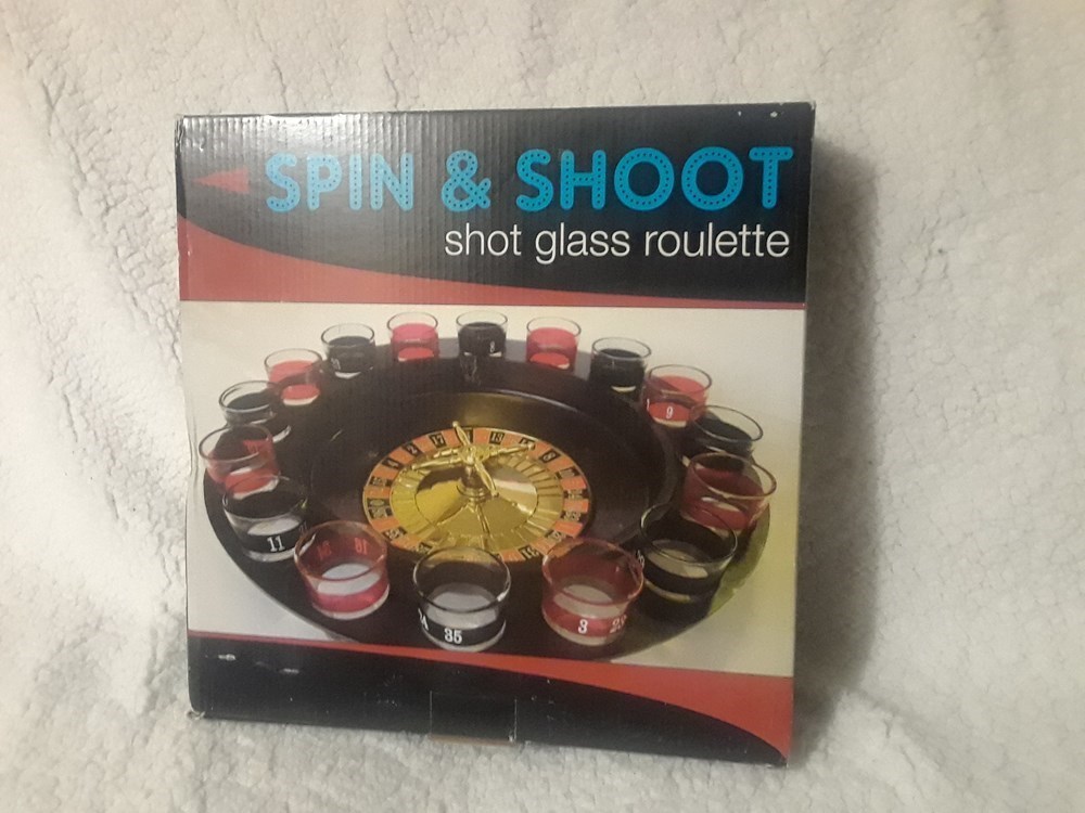 Item is NEW w/ box *Shot Glass Roulette is the Drinking Man's Game Of Chance *Spin the Wheel and Let Chance Determine Your Fate *Be the Croupier at Your Next Party *The Ultimate Ice Breaker at Any Social Event Includes Sixteen Shot Glasses and Two Roulette Balls