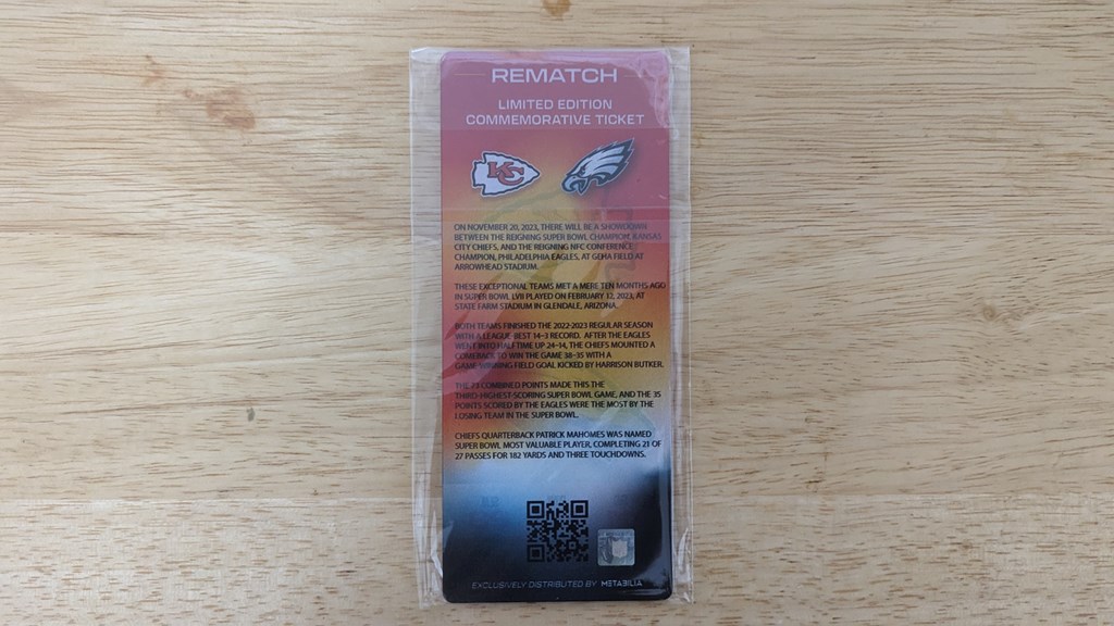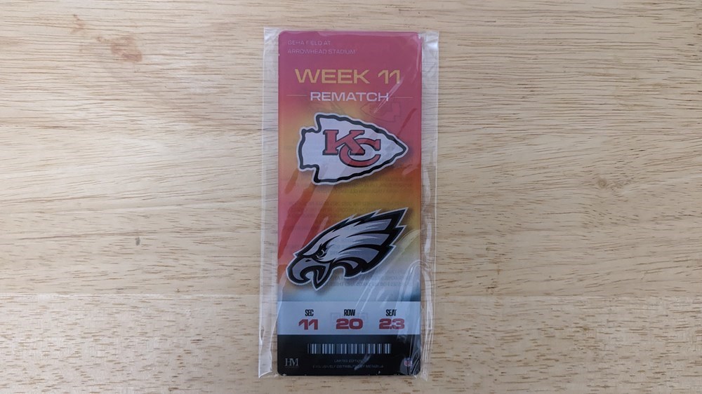 LIMITED EDITION commemorative ticket from the SBLVII Rematch game between the Chiefs and the Eagles on Week 11. Get this awesome collectible acrylic souvenir of this historic rematch! All commemorative tickets are 1 of a limited production of 1000 from each game, and are sourced directly from Metabilia.