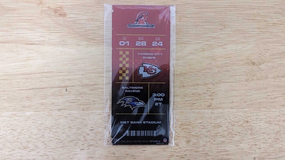 LIMITED EDITION commemorative ticket from the AFC Championship game between the Chiefs and the Ravens in the 2023 playoffs. Get this awesome collectible acrylic souvenir of this historic rematch! All commemorative tickets are 1 of a limited production of 1000 from each game, and are sourced directly from Metabilia.