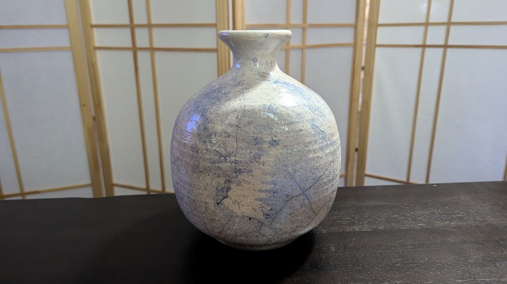 A Raku ware pottery vase created by award-winning local artist Al Letner. From the artist --------------- My beginnings with clay and art, in general, began in college. After my adventures with the military, I transferred my credits to a small Midwestern College in Pittsburg, KS, and was fortunate to find myself in a dynamic and competitive art environment in the early 1970’s. Graduating in 1976 with a degree in Education, I spent the next 30 years teaching and learning about clay as well as other art media. I have taught on the High School and College level, adult night classes, workshops and demonstrations involving several media from clay to collage and sculpture. As far as my work goes, each piece is an individual work of art/craft. No two are the same and all work is signed by me and my studio stamps are usually applied at the foot ring. I control the process of design, creation, and firing, personally. No one else works in my studio. I work in series and try to develop a particular design direction to its conclusion, and then move on. To chronicle my influences would seem similar to most of the generation of potters I come from; the Oriental cultures, as well as design concepts from other disciplines, be they architecture, collage’, or simply nature itself.