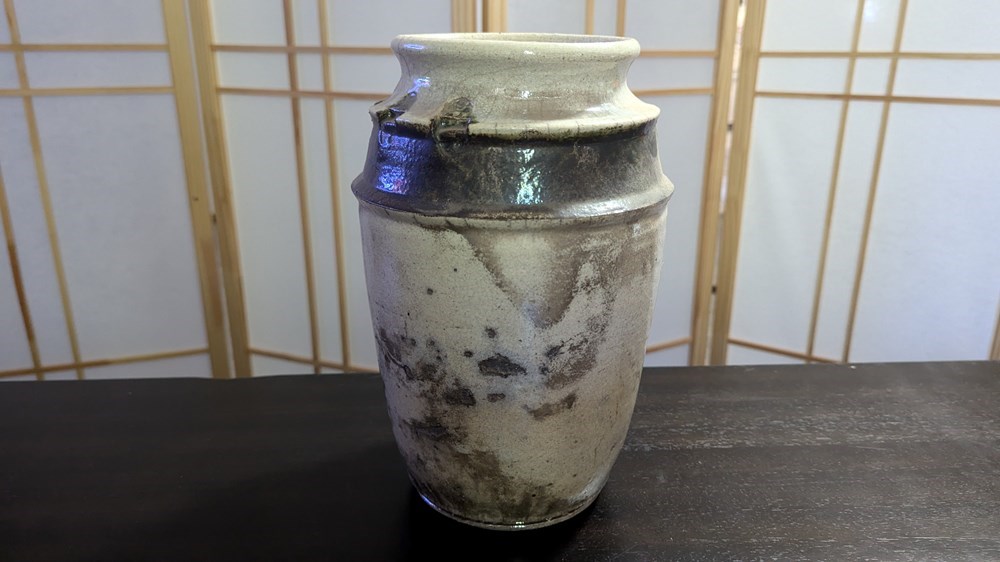 A Raku ware pottery vase created by award-winning local artist Al Letner. From the artist --------------- My beginnings with clay and art, in general, began in college. After my adventures with the military, I transferred my credits to a small Midwestern College in Pittsburg, KS, and was fortunate to find myself in a dynamic and competitive art environment in the early 1970’s. Graduating in 1976 with a degree in Education, I spent the next 30 years teaching and learning about clay as well as other art media. I have taught on the High School and College level, adult night classes, workshops and demonstrations involving several media from clay to collage and sculpture. As far as my work goes, each piece is an individual work of art/craft. No two are the same and all work is signed by me and my studio stamps are usually applied at the foot ring. I control the process of design, creation, and firing, personally. No one else works in my studio. I work in series and try to develop a particular design direction to its conclusion, and then move on. To chronicle my influences would seem similar to most of the generation of potters I come from; the Oriental cultures, as well as design concepts from other disciplines, be they architecture, collage’, or simply nature itself.