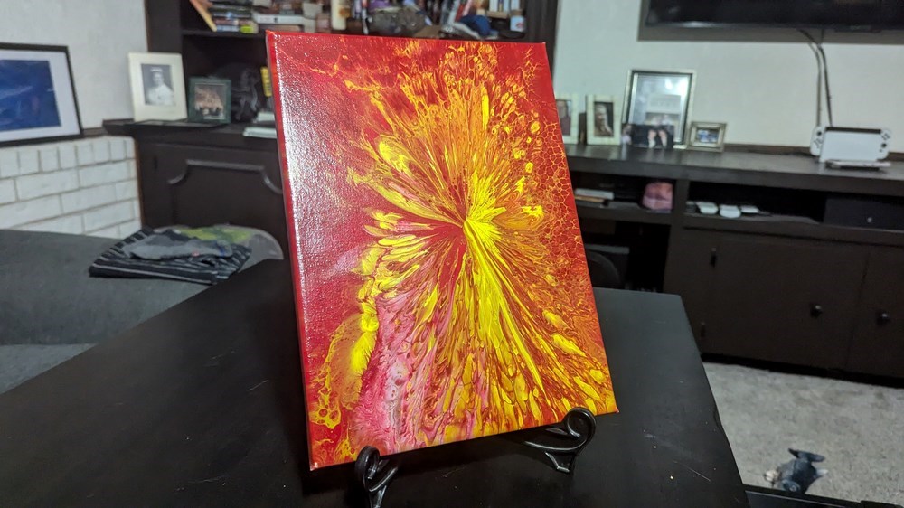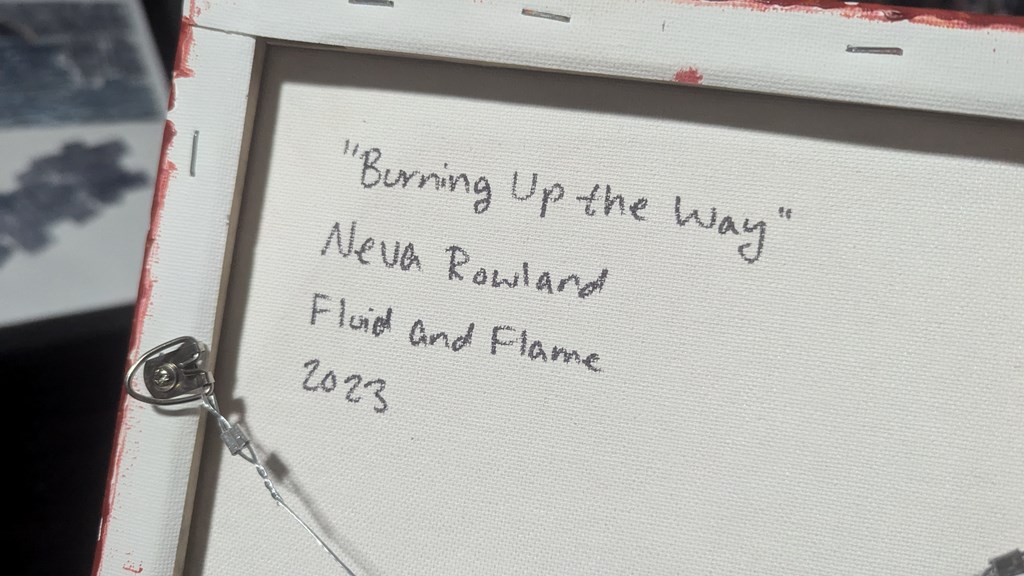 "Burning Up the Way" is an 2023 9" x 12" acrylic work by local artist Neva Rowland.