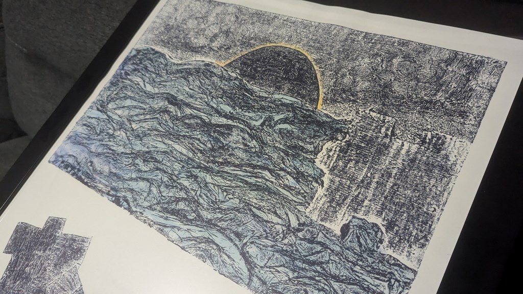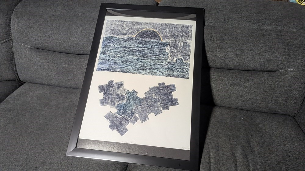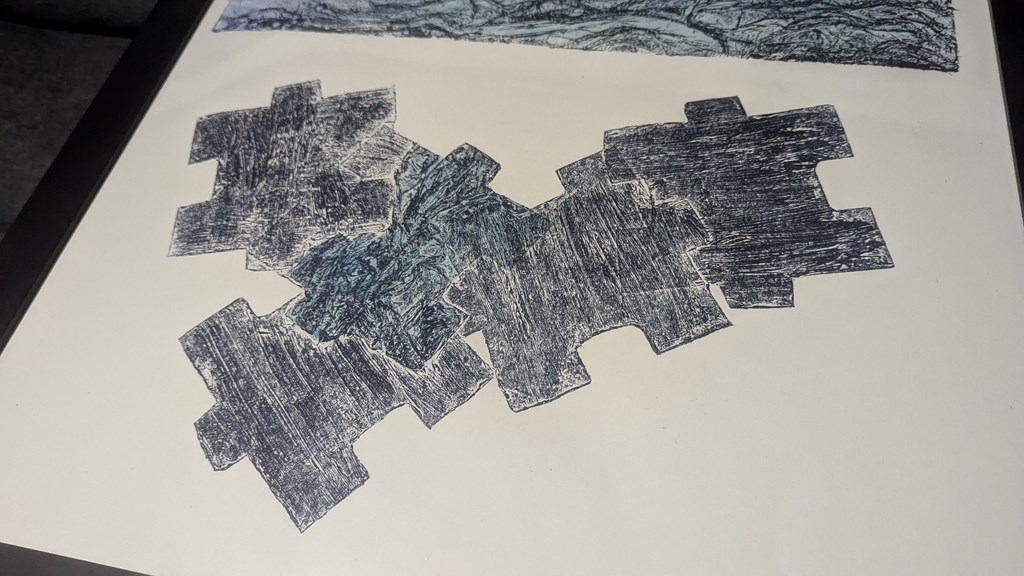 "Missing Piece" is a framed 20"x30" colography print by local artist Crystal Davis. The print was created by using a cardboard piece and applying layers of items to it. These included card stock, plastic wrap, sand, and thick application of glue with a paint brush to create texture. This is a two plate print, which means that two plates were made to make a complete image. Ink is rolled using a ink roller onto the plate and then ran through the press to print the image onto dry paper.
