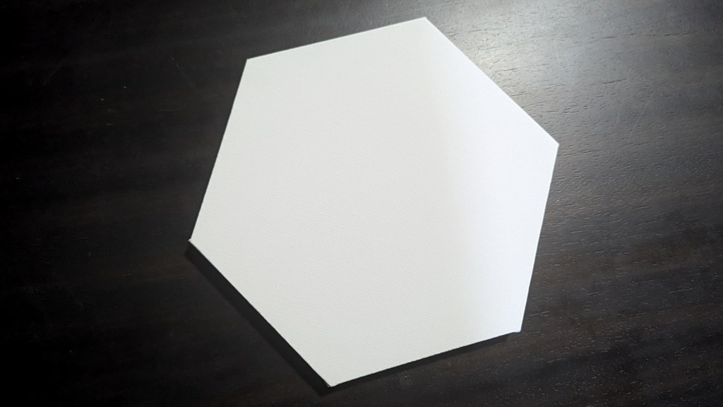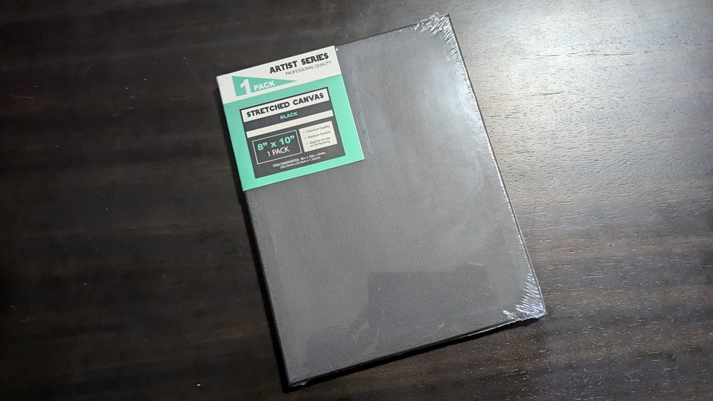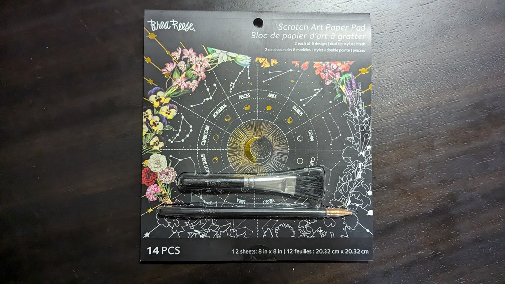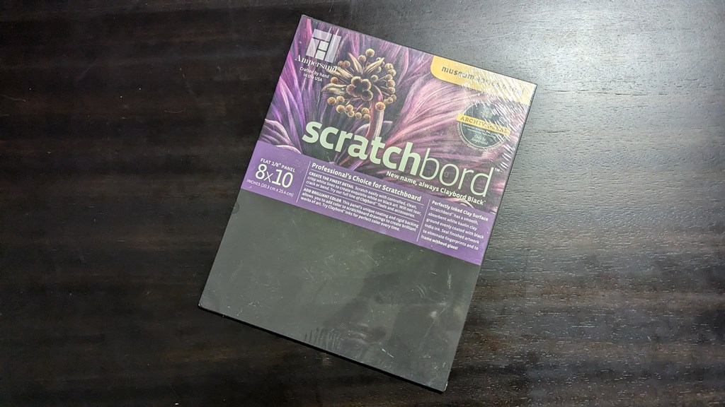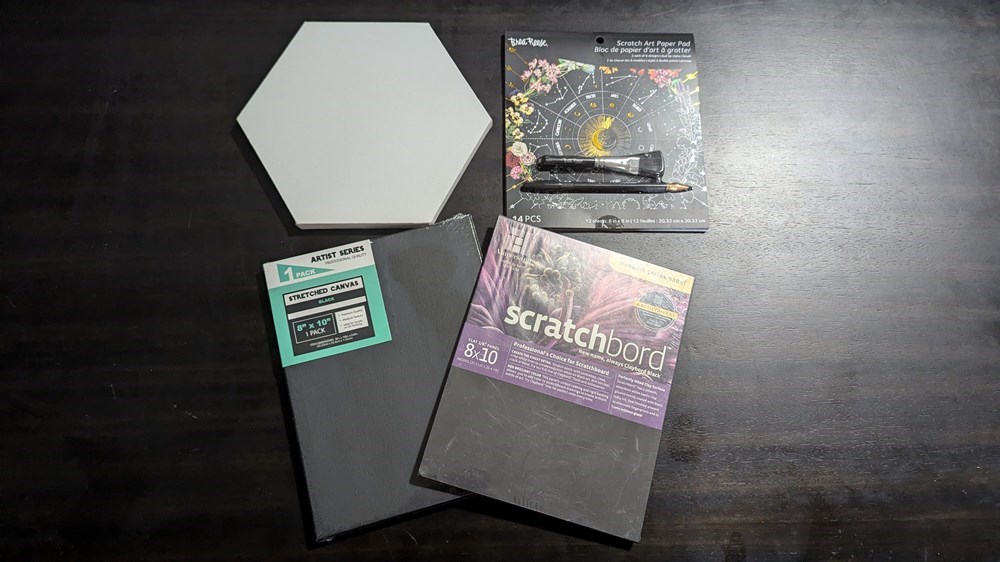 A 4-piece lot of assorted art supplies. - Brea Reese art scratch pad with brush and pencil. - 8" hexagon canvas - Ampersand 8"x10" Scratchbord in Claybord Black - 8"x10" black stretched canvas