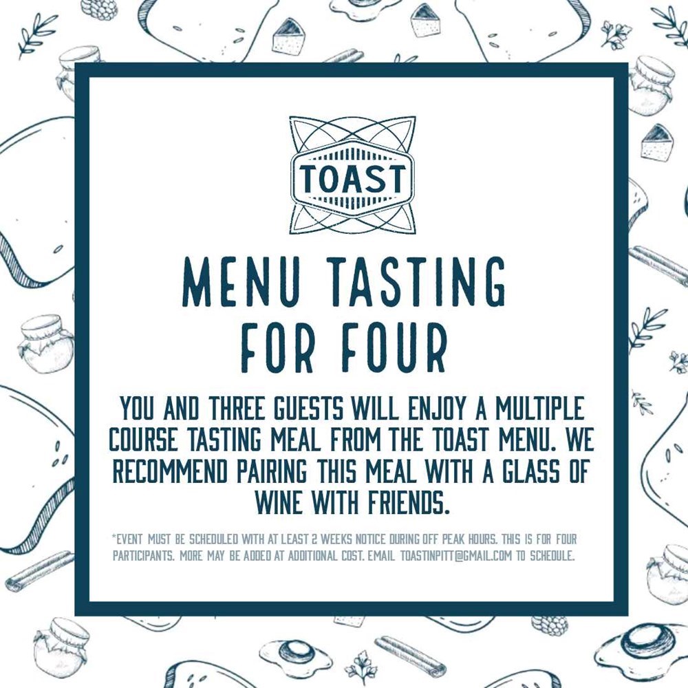 Enjoy a menu tasting for four at TOAST in Downtown Pittsburg. You and three guests will enjoy a multiple course tasting meal from the TOAST menu*. * Retail value $150. No cash value. Event must be scheduled with at least 2 weeks notice during off peak hours. This is for four (4) participants. More may be added at additional cost. Email toastinpitt@gmail.com to schedule.