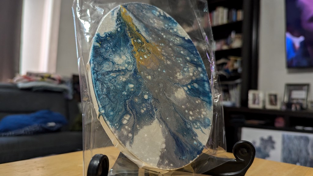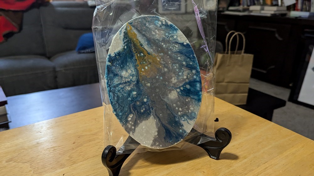 4"x6" oval painting. Aqua Golden Bloom. About the Artist ----------------- Michaele Fienen, Artist with Michaele's Art Nook.