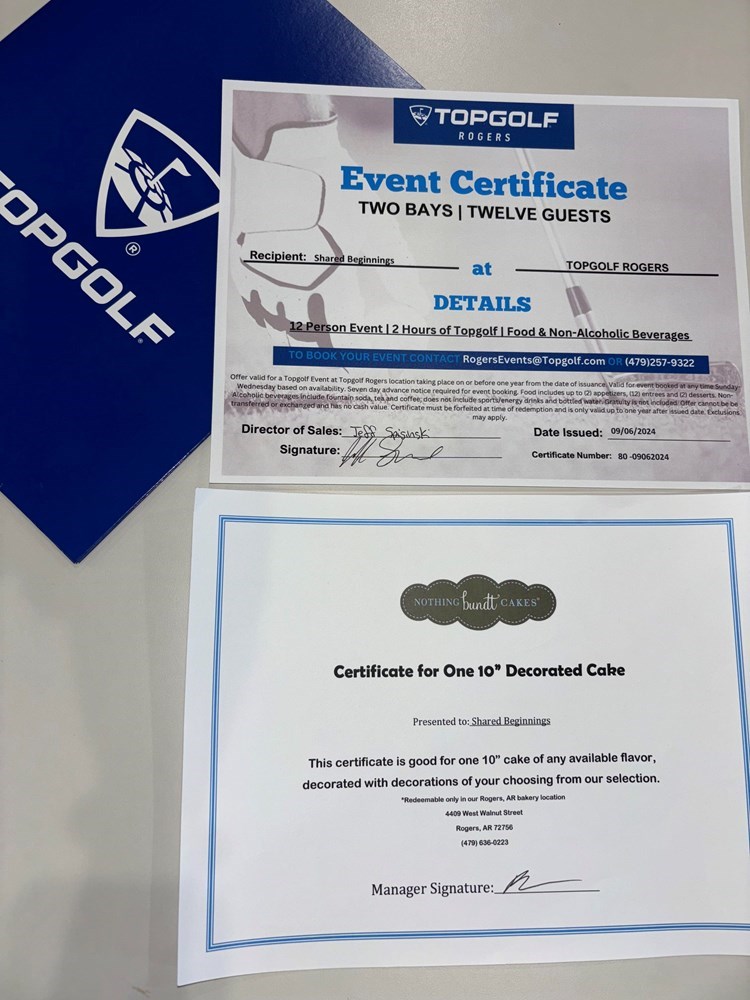 Item delivery: All items are able to picked up during the event after the auction has ended and the item has been paid for. If you are not able to pick up your item during the event, please contact letschat@sharedbeginnings.org or text 479-866-0559 to schedule a pickup time.