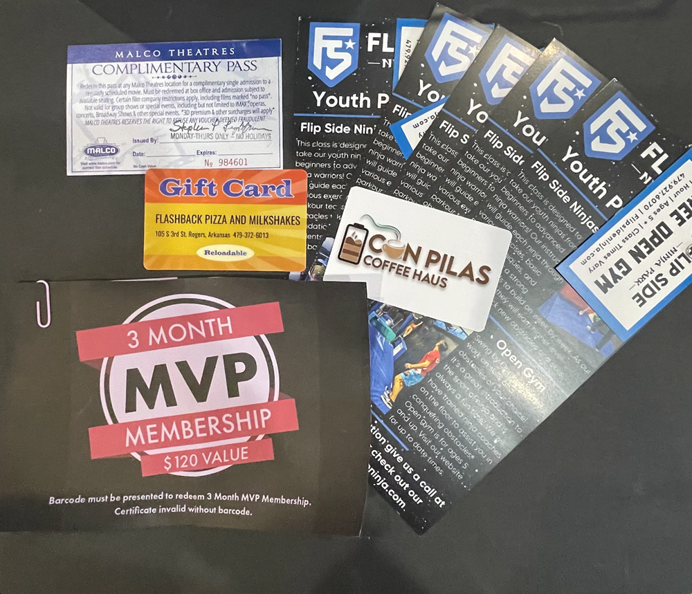 How about some family fun!! Give your family a taste of the good old days with a gift card to Flashback Pizza and Milkshakes in downtown Rogers, then head over to Lowell to enjoy open gym sessions at Flip Side Ninja Park! Enjoy a fun, and productive day with this family package. Start the day off right at Con Pilas Coffeehaus. Next, venture over to Club Car Wash and take advantage of your new VIP membership. Finish off the day enjoying a movie at Malco! Package Includes: $100 Con Pilas Coffeehaus Gift Card- Springdale Club Car Wash 3 months VIP 4 Malco Movie Tickets $50 Flashback and Milkshakes 5 Day passes to the Flipside Ninja Park https://www.facebook.com/FlashbackPizza/ https://flipsideninja.com/